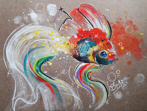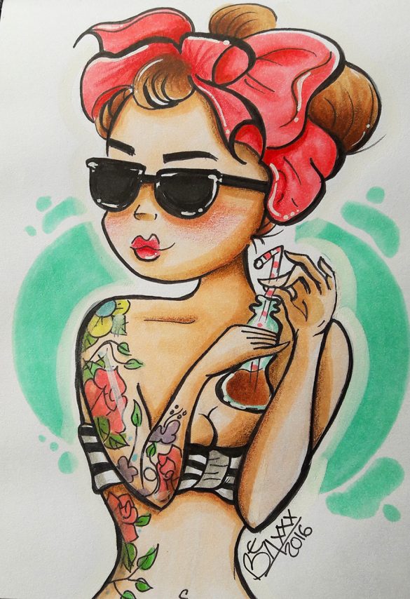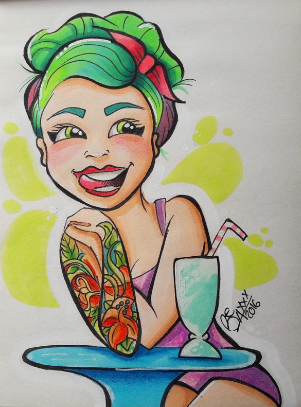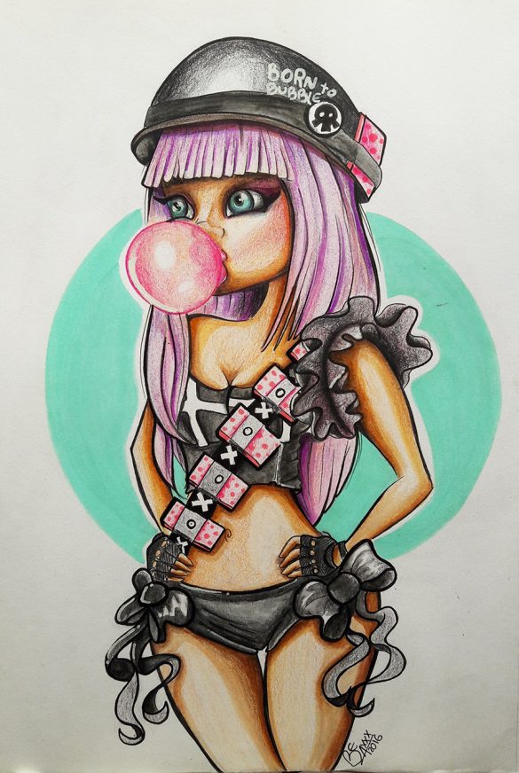 Las lustraciones de Bebba son realizadas en diferentes técnicas pero su favorita es el ecolin sobre el papel acuarela, le gusta el realismo con demasiado color, también hace caricaturas de chicas tatuadas y animales. Le gusta experimentar pintando con acrílicos, colores, marcadores, ecolines, hasta café con leche.